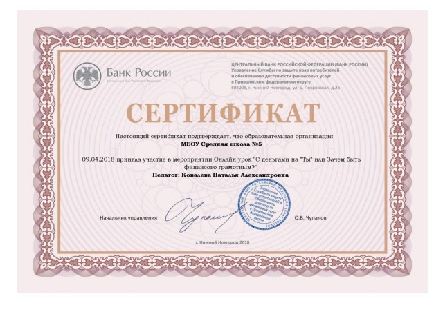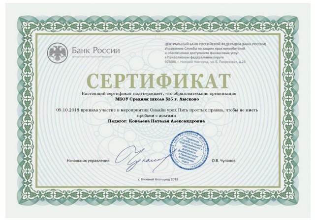Сертификат об участии в онлайн-уроке "Финансовая грамотность" 1, 2018 |