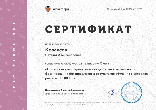 Сертификат о прохождении курсов "Проектная и исследовательская деятельность как способ формирования метапредметных результатов обучения в условиях реализации ФГОС" 72 ч. (2016) |