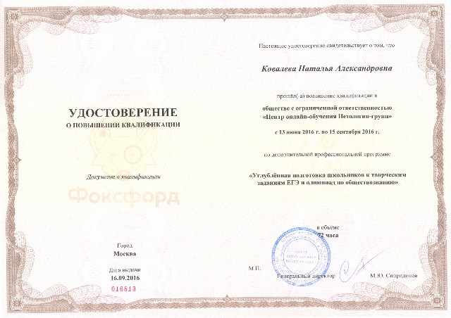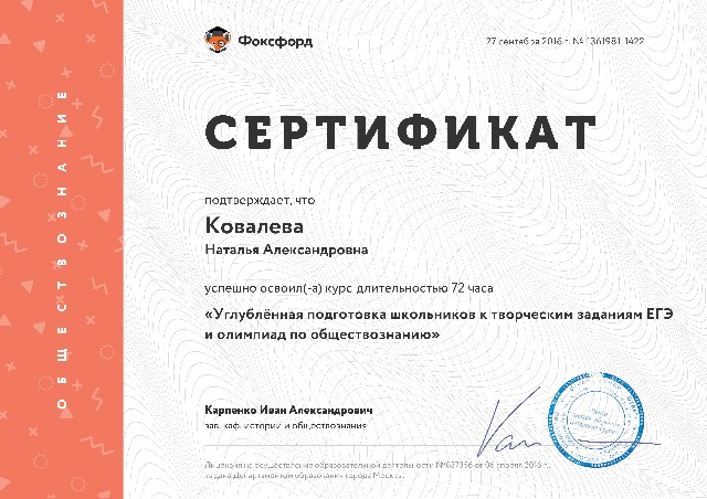 Сертификат о прохождении курса "Углубленная подготовка школьников к творческим заданиям ЕГЭ и олимпиад по обществознанию" 72 ч. (2016) |
