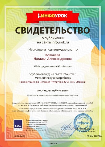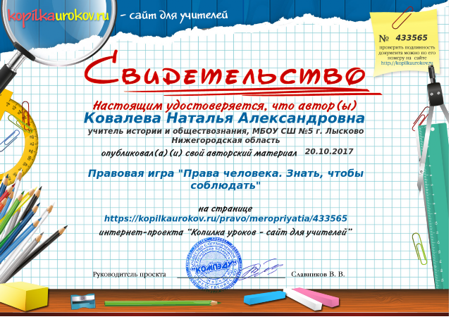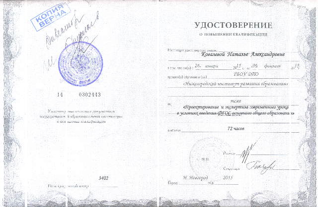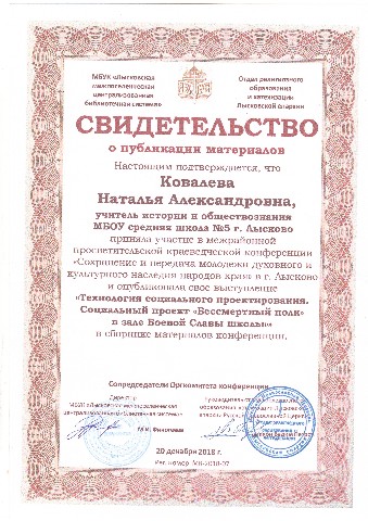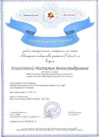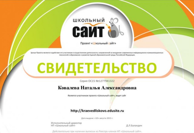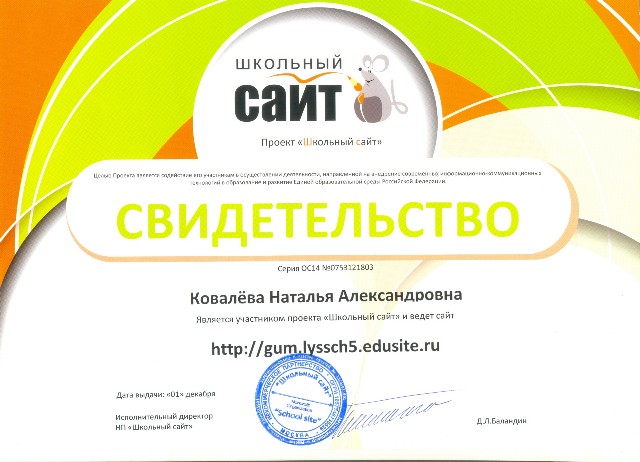 Свидетельство Ковалевой Н.А., что она является членом НП "Школьный сайт", ведет сайт гуманитарного цикла школы и участвует в работе сетевого профессионального сообщества "Школьный сайт" |