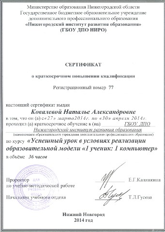 ДО "Успешный урок" мастер-класс "Модель: 1 ученик - 1 компьютер" Кудимова Н. НИРО (2015) |