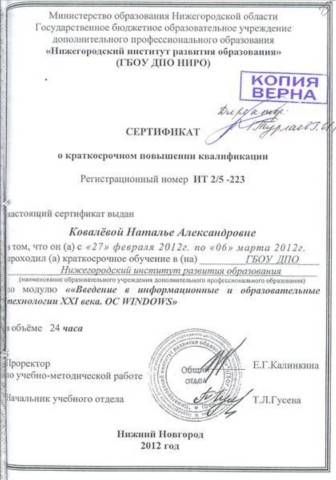Сертификат о краткосрочном повышении квалификации в ГБОУ ДПО "Нижегородский институт развития образования" по модулю "Введение в информационные и образовательные технологии XXI века. OC WINDOWS" 24 ч. (2012) |