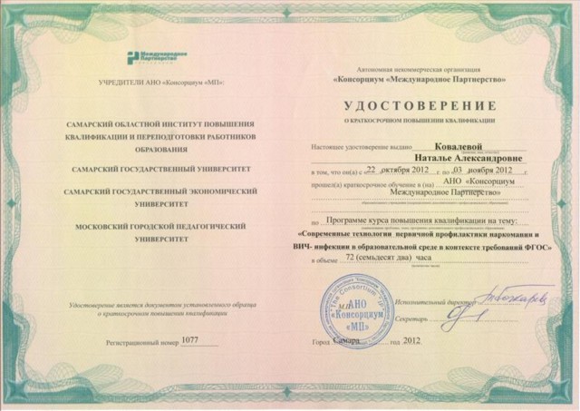 Удостоверение о краткосрочном повышении квалификации в АНО "Консорциум Международное партнерство" по программе "Современные технологии первичной профилактики наркомании и ВИЧ-инфекции в образовательной среде в контексте требований ФГОС" 72 ч. (2012) |