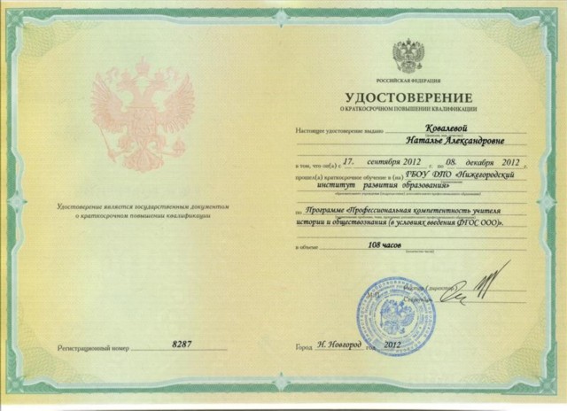 Удостоверение о краткосрочном повышении квалификации ГБОУ ДПО "Нижегородский институт развития образования" по программе "Профессиональная компетентность учителя истории и обществознания (в условиях введения ФГОС ООО)" 108 ч. (2012) |