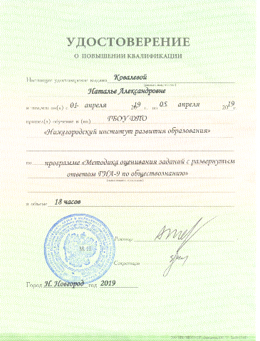 Удостоверение о повышении квалификации по программе "Методика оценивания заданий с развернутым ответом ГИА-9 по обществознанию 18 ч. (2019) |