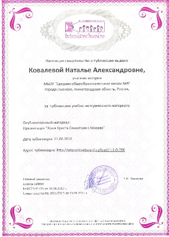 Свидетельство о публикации учебно-методического материала классного часа "Храм Христа Спасителя" на сайте Interactiveboard.ru, 2015 |