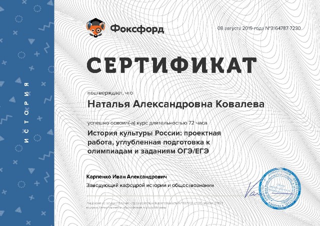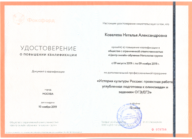 Удостоверение о повышении квалификации по дополнительной профессиональной программе "История культуры России: проектная работа, углубленная подготовка к олимпиадам и заданиям ОГЭ/ЕГЭ" 72 часа (Фоксфорд, 2019) |