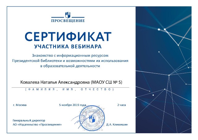 Сертификат участника вебинара "Знакомство с информационным ресурсом Президентской библиотеки и возможностями их использования в образовательной деятельности" 2 ч. (2019) |