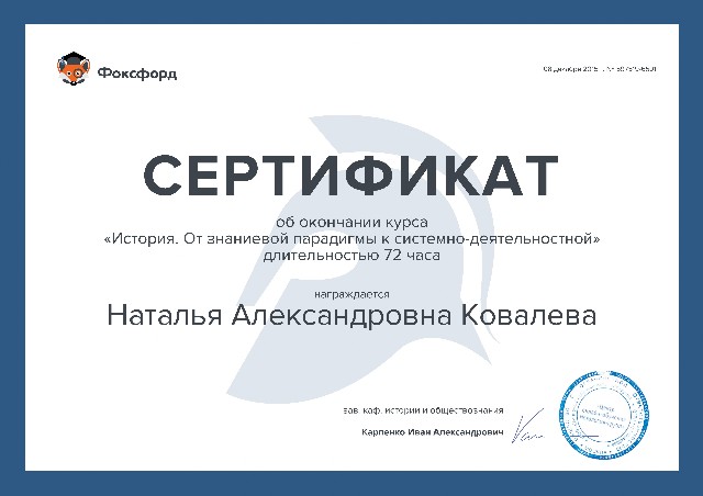 Сертификат об окончании курса "История. От знаниевой парадигмы к системно-деятельностной" 72ч. (2015) |