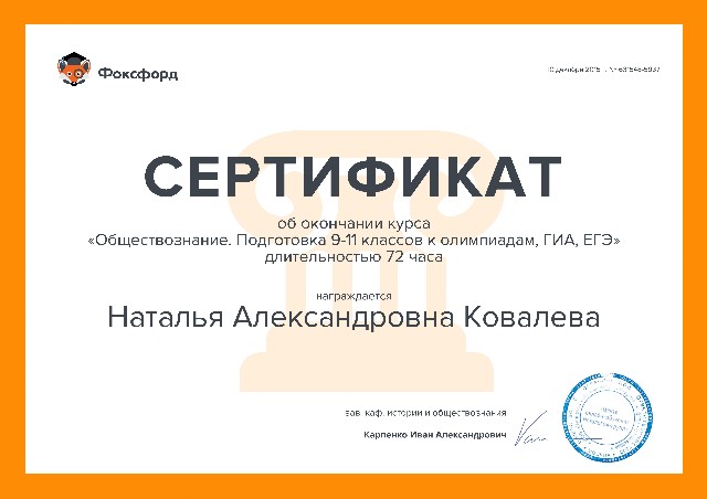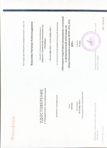 Удостоверение о повышении квалификации "Фоксфорд" "Методики подготовки школьников к итоговой и промежуточной аттестации по обществознанию в рамках ФГОС: ЕГЭ, ОГЭ, ВПР" 72 часа (2021) |