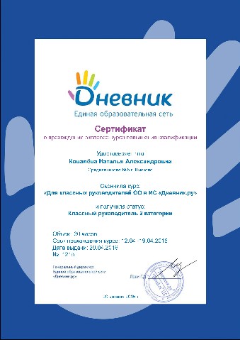 Сертификат о прохождении экспресс-курса повышения квалификации "Для классных руководителей ОО в ИС "Дневник.ру" (2016) |