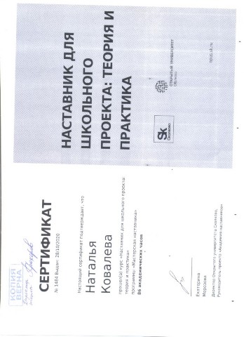 Сертификат курса "Наставник для школьного проекта: теория и практика" 86 часов Открытый университет Сколоково (2020) |