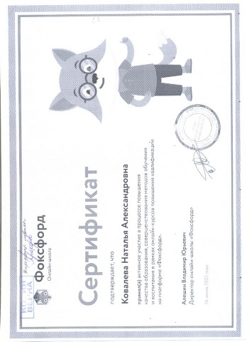 Сертификат онлайн-курсов повышения квалификации на платформе "Фоксфорд" (2020) |