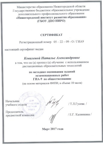 Сертификат по методике оценивания заданий экзаменационных работ ГИА-9 по обществознанию 18 ч. (2017) |