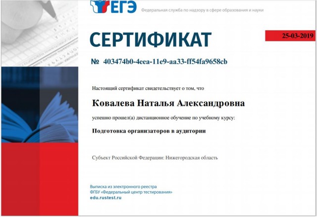 Сертификат дистанционного обучения по учебному курсу "Подготовка организаторов ЕГЭ в аудиторию" (2019) |