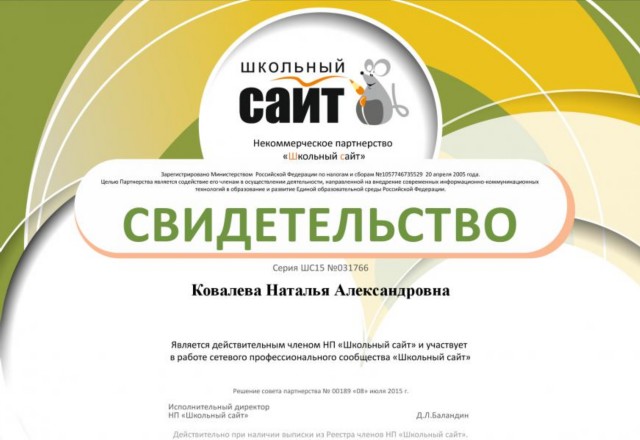 Свидетельство Ковалевой Н.А., что она является членом НП "Школьный сайт" и участвует в работе сетевого профессионального сообщества "Школьный сайт" |