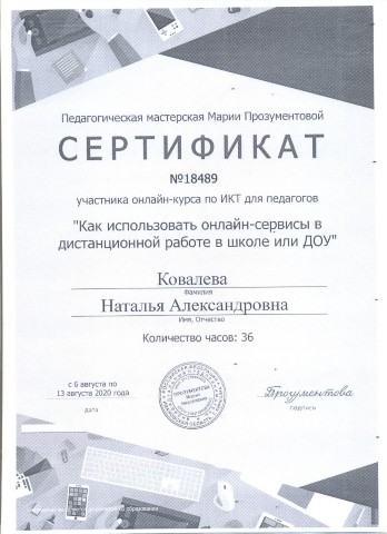 Сертификат участника онлайн-курса по ИКТ для педагогов "Как использовать онлайн-сервисы в дистанционной работе в школе.." 36 часов (2020) |