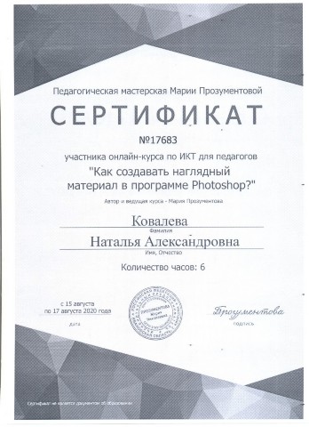 Сертификат участника онлайн-курса по ИКТ для педагогов "Как создавать наглядный материал..." 6 часов (2020) |