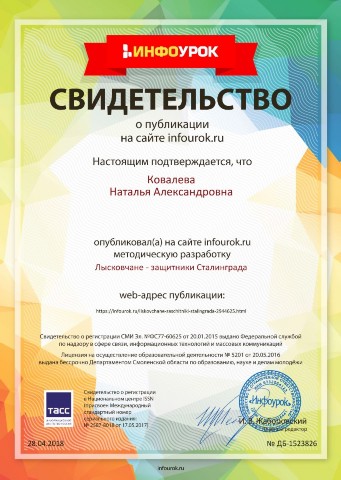 Свидетельство Ковалевой Н.А., что она является членом НП "Школьный сайт", ведет сайт "Лысковский краевед" и участвует в работе сетевого профессионального сообщества "Школьный сайт" |