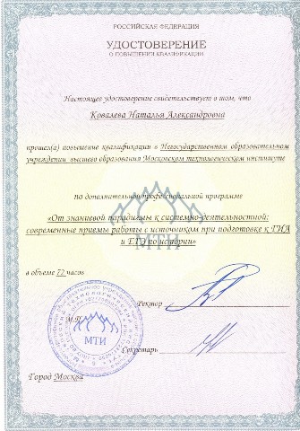 Удостоверение о повышении квалификации по дополнительной профессиональной программе "От знаниевой парадигмы к системно-деятельностной: современные приемы работы с источником при подготовке к ГИА и ЕГЭ по истории" (2015) |