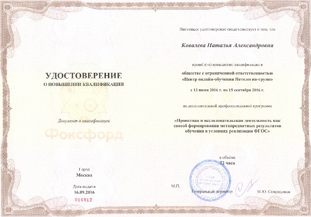 Удостоверение о повышении квалификации по дополнительной профессиональной программе "Проектная и исследовательская деятельность как способ формирования метапредметных результатов обучения в условиях реализации ФГОС" (2016) |
