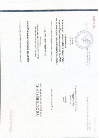 Удостоверение о повышении квалификации "Фоксфорд" "Историко-краеведческая деятельность как средство достижения метапредметных результатов в современном обучении и воспитании" 72 часа (2021) |
