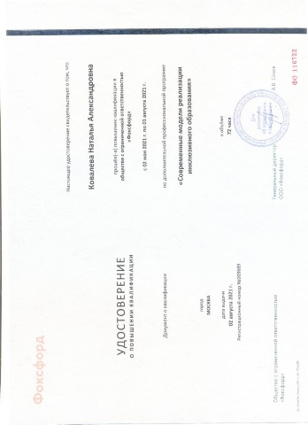 Удостоверение о повышении квалификации "Фоксфорд" " Современные модели реализации инклюзивного образования" 72 часа (2021) |