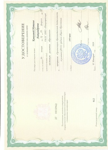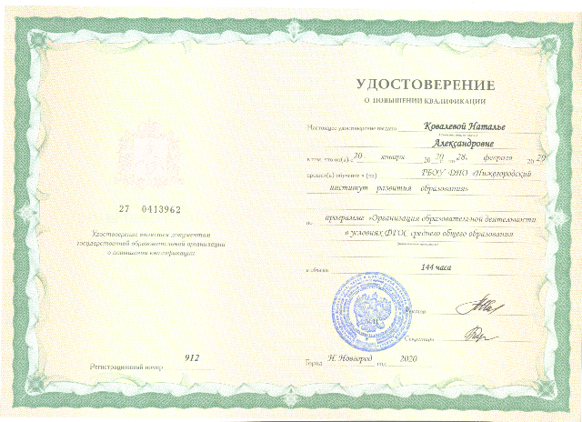 Удостоверение о краткосрочном повышении квалификации ГБОУ ДПО "Нижегородский институт развития образования" по программе "Организация образовательной деятельности в условиях ФГОС среднего общего образования" 144 ч. (2020) |