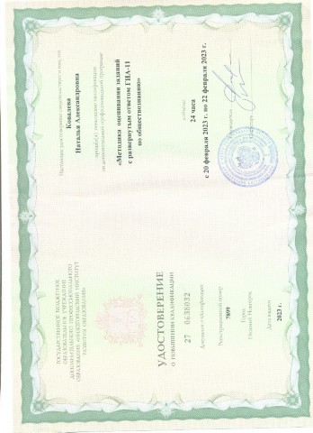 Удостоверение о повышении квалификации ГБОУ ДПО "Нижегородский институт развития образования" по программе "Методика оценивания заданий с развернутым ответом ГИА-11 по обществознанию" 24 часа (2023) |