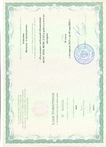 Удостоверение о повышении квалификации ГБОУ ДПО "Нижегородский институт развития образования" по программе "Реализация требований обновленных ФГОС ООО, ФГОС СОО в работе учителя" история 36 часов (2023) |