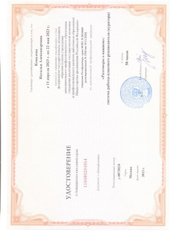 Удостоверение о повышении квалификации ФГАОУ ДПО "Академии реализации государственной политики и профессионального развития работников образования Министерства просвещения Российской Федерации по дополнительной профессиональной программе "Разговоры о важном: система работы классного руководителя (куратора)" 58 часов (2023) |