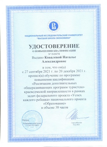 Удостоверение о повышении квалификации "Реализация дополнительных общеразвивающих программ туристско-краеведческой направленности в рамках задач федерального проекта "успех каждого ребенка" национального проекта "Образование" 38 часов ВШЭ (2021) |