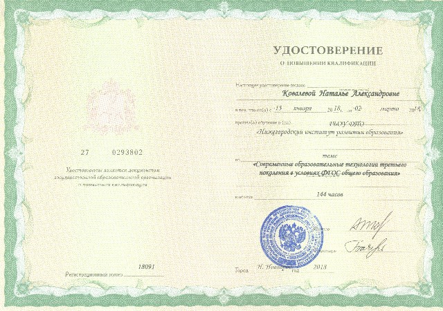 Удостоверение о повышении квалификации по дополнительной профессиональной программе "Современные образовательные технологии третьего поколения в условиях ФГОС общего образования" 144 ч. (2018) |