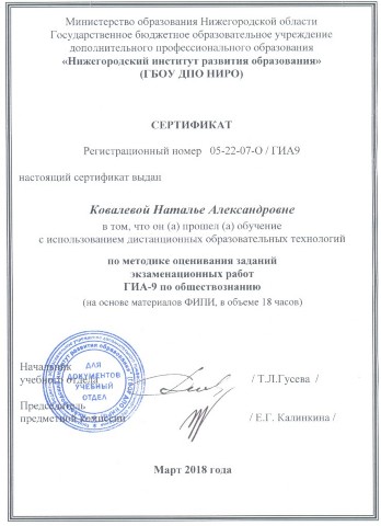 Сертификат по методике оценивания заданий экзаменационных работ ГИА-9 по обществознанию 18 ч. (2018) |