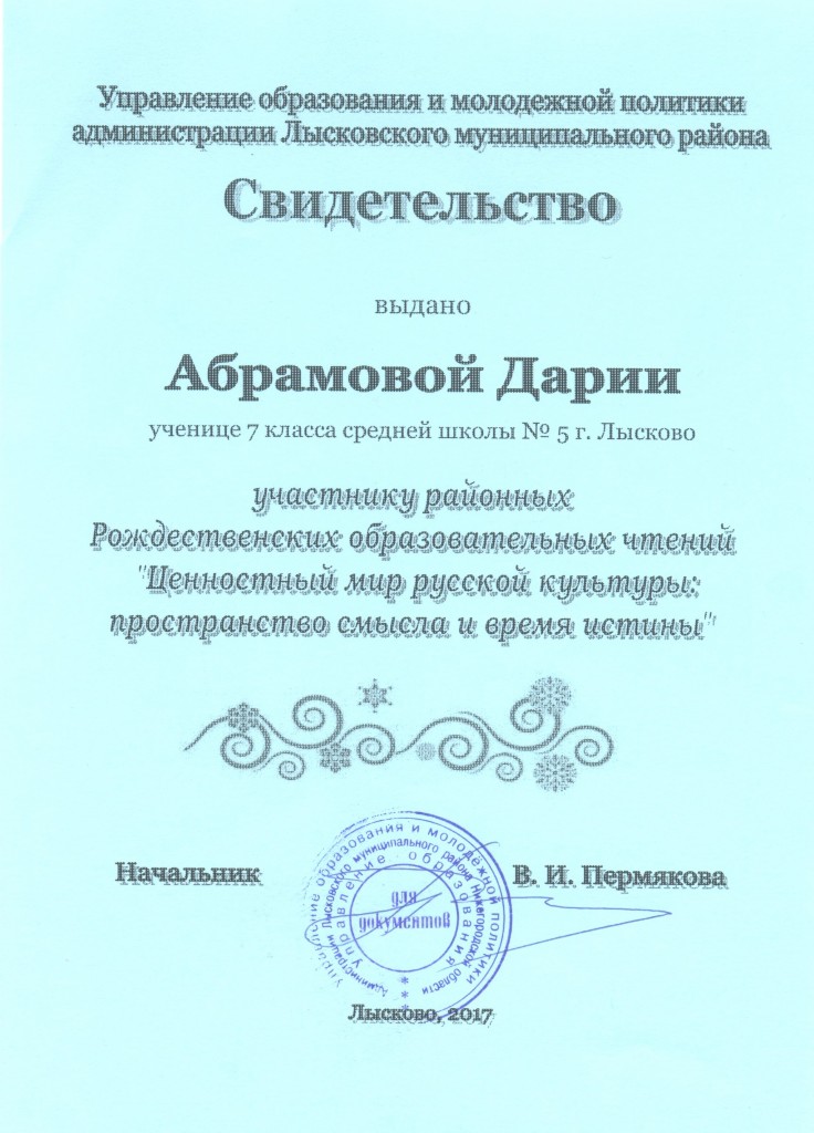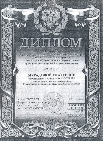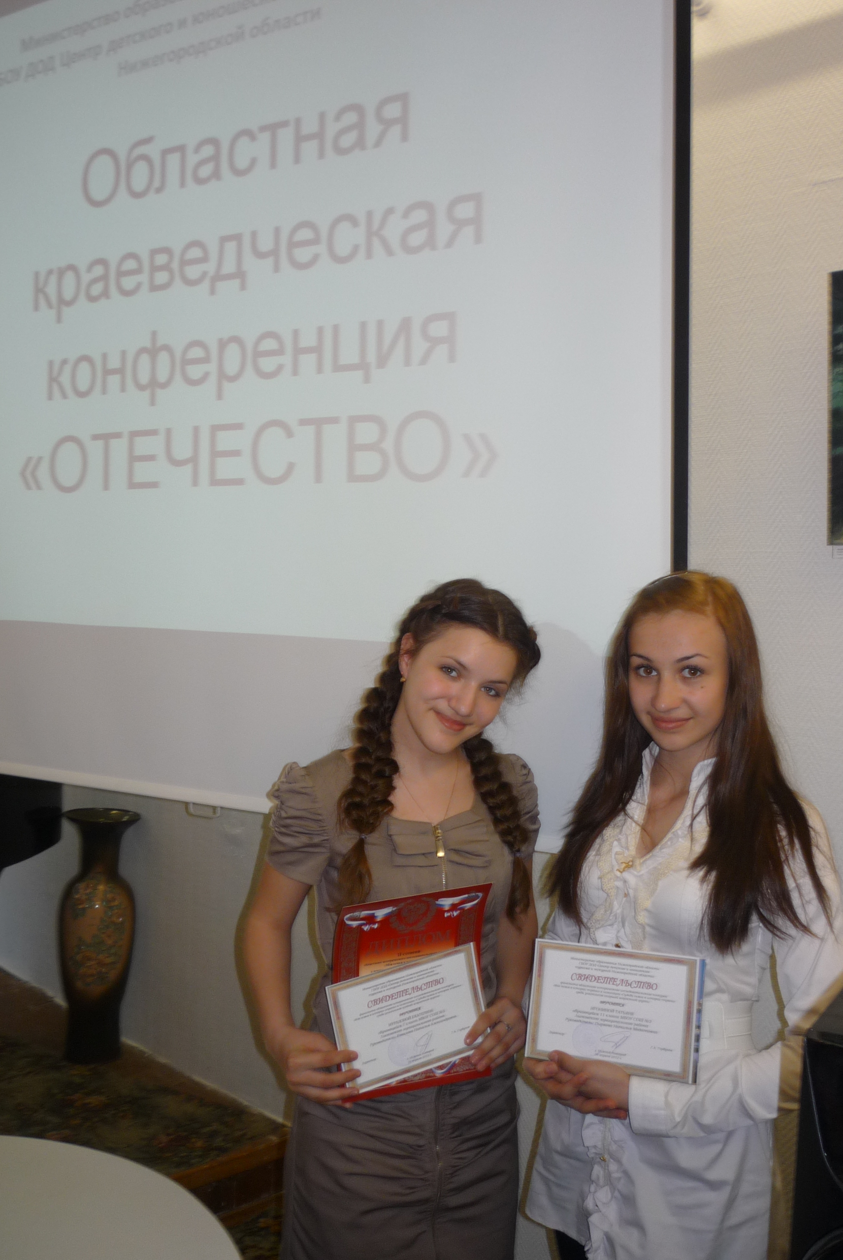 Областная краеведческая конфереция " Отечество",проводившаяся Министерством образования Нижегородской области и ГБОУ ДОД "Центр детского туризма и экскурсий" Мурадова Екатерина, 7 класс, исследовательская работа "Судьба семьи в истории страны", победитель районого этапа, призер областного этапа.