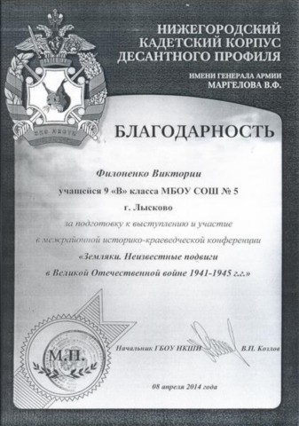 Историко-патриотическая краеведческая межрайонная конференция «Земляки. Неизвестные подвиги в Великой Отечественной войне 1941-1945 гг.», посвященная 69-й годовщине со Дня Победы, которая состоялась в нижегородском кадетском корпусе им. генерала В.Ф. Маргелова в Балахне. Филоненко Виктория, 9 класс, исследовательская работа "На Иванах вся Россия держится".