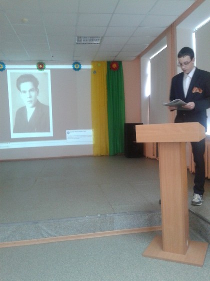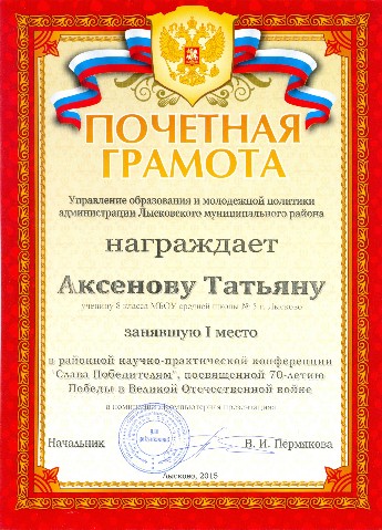 Научно-практическая конференция школьников "Слава победителям", посвященная 70-летию Великой Победы в Великой Отечественной войне 1941-1945 гг., Аксенова Татьяна, 9 класс, компьютерная презентация "Есть память, которой не будет конца!", победитель.