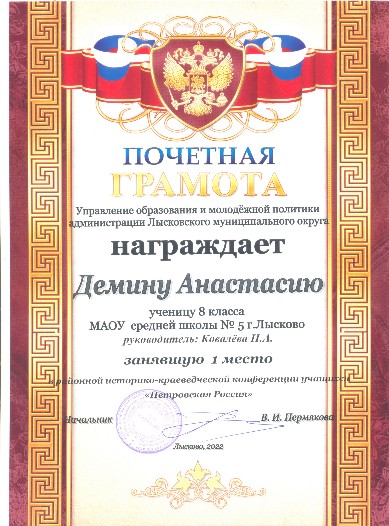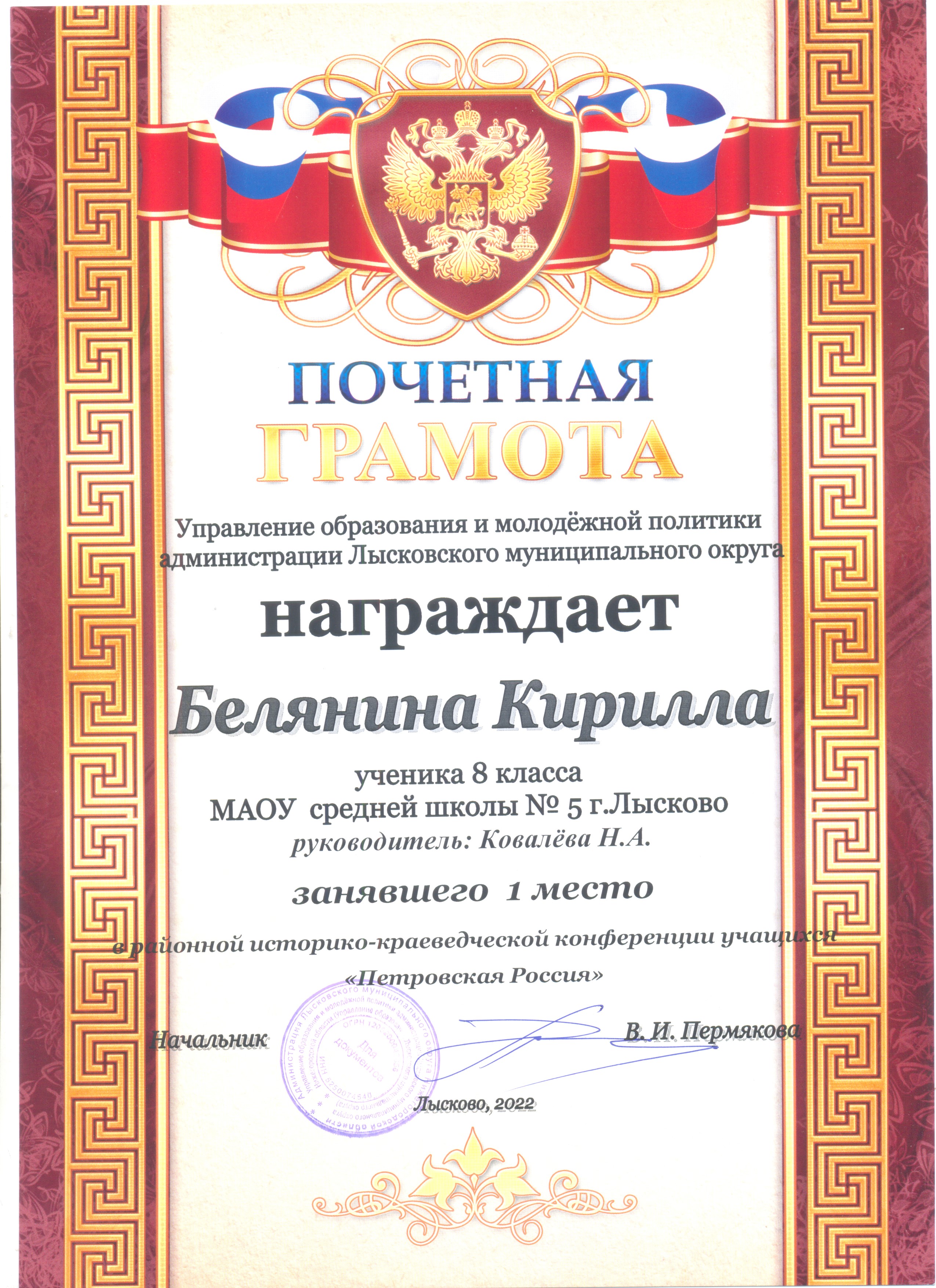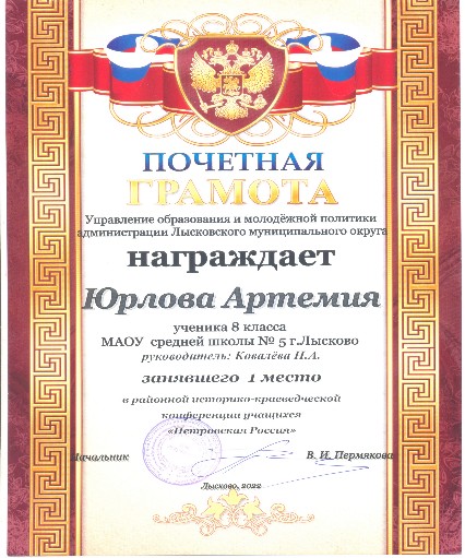 Районная краеведческая конференция учащихся "Петровская Россия", посвященная 350-летию со дня рождения Петра Великого, Юрлов Артемий, Демина Анастасия, Белянин Кирилл, 8 класс, исследовательская работа "Рождение российского флота", победители, 2022.