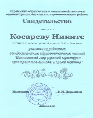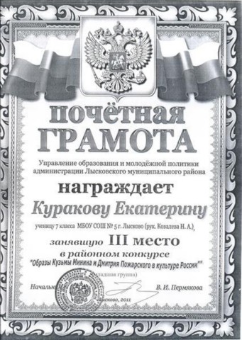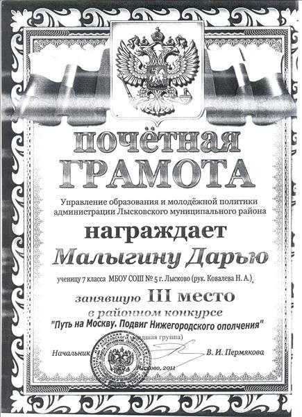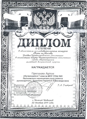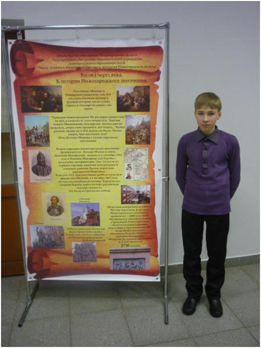 Областная краеведческая конференция "Отечество",проводившаяся Министерством образования Нижегородской области и ГБОУ ДОД "Центр детского туризма и экскурсий", посвященная подвигу Нижегородского ополчения 1612 года, Пропажин Артем, 7 класс, исследовательская работа "Путь Нижегородского ополчения", призер областного этапа.