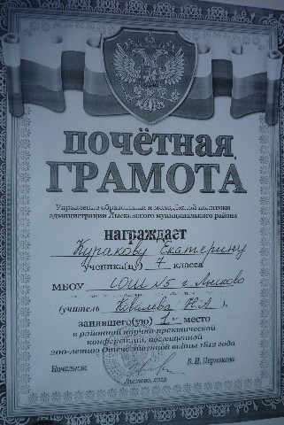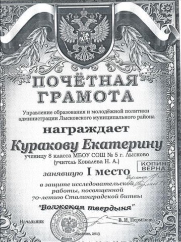 Районная научно-практическая конференция, посвященная 70-летию Сталинградской битвы "Волжская твердыня", Куракова Екатерина, 8 класс, исследовательская работа и презентация "Горьковчане в Сталинградской битве", победитель районного этапа.