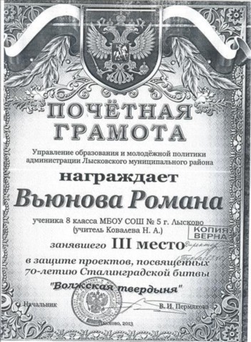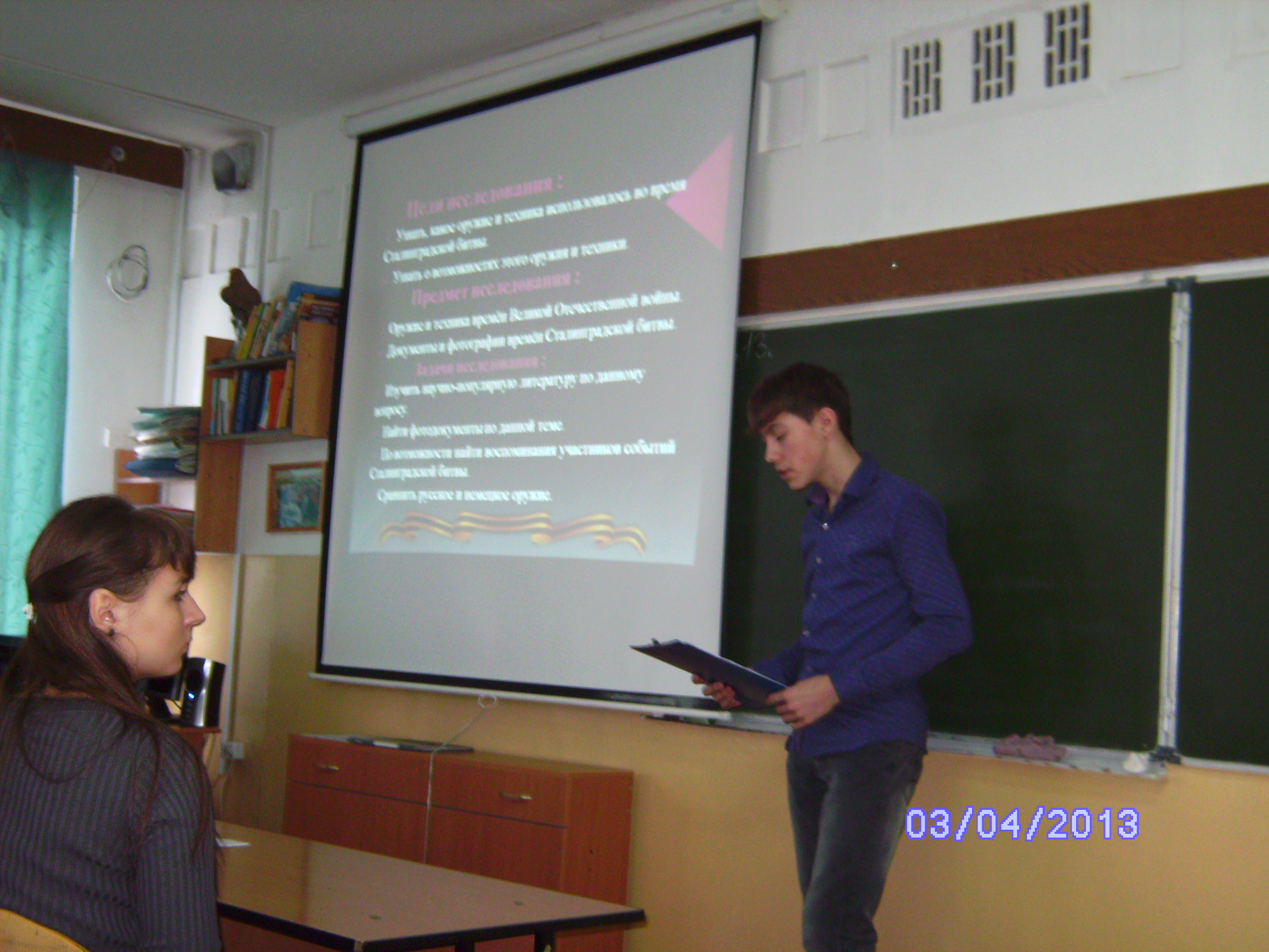 Районная научно-практическая конференция, посвященная 70-летию Сталинградской битвы "Волжская твердыня", Вьюнов Роман, 8 класс, презентация "Виды вооружения. Сталинградская битва", призер районного этапа.