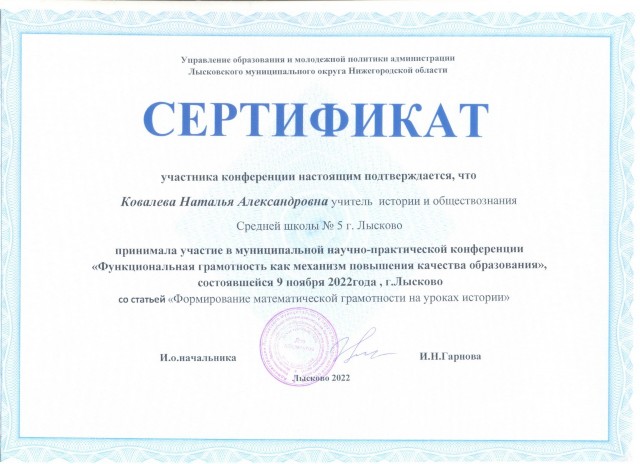 Сертификат участника Муниципальной научно-практической конференции "Функциональная грамотность как механизм повышения качества образования" со статьей "Формирование математической грамотности на уроках истории", 9.11.2022