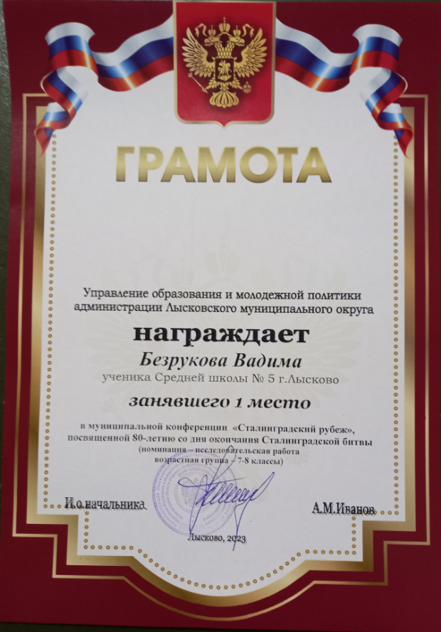 Районная историческая конференция учащихся «Сталинградский рубеж», посвященная 80-летию со дня окончания Сталинградской битвы, участник - ученик 7 класса Безруков Вадим, исследовательская работа "Дорога жизни Сталинграда. Волжская рокада", победитель, 2023